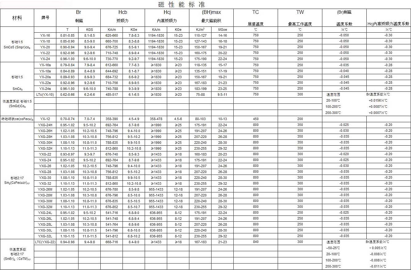 钐钴磁铁性能参数表
